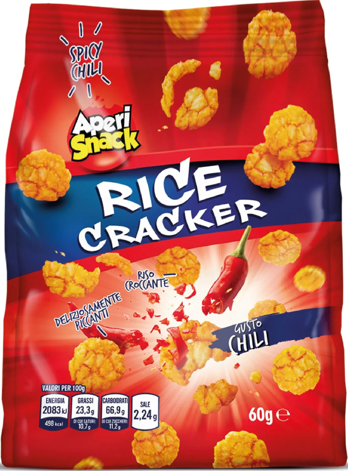Scopri i Rice Cracker Aperisnack, snack sfiziosi e ricchi di storia, ispirati alla tradizione giapponese dei Senbei. Preparati con riso glutinoso di alta qualità e ricoperti da una speciale miscela di chili, paprika dolce e peperoncino, questi cracker offrono un mix sorprendente di dolcezza e piccantezza che li rende semplicemente irresistibili.