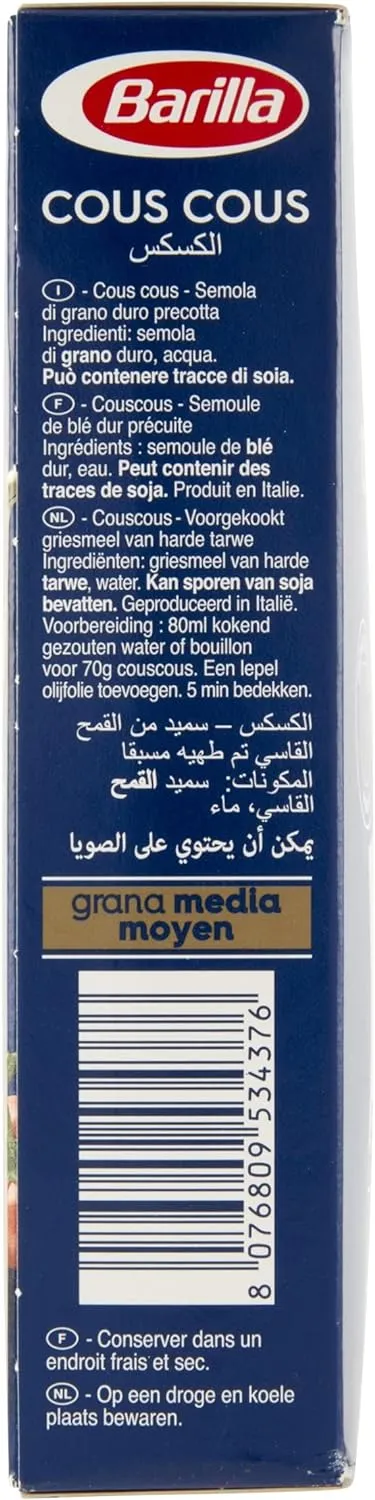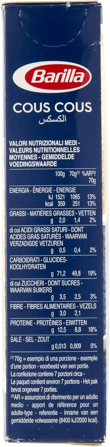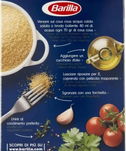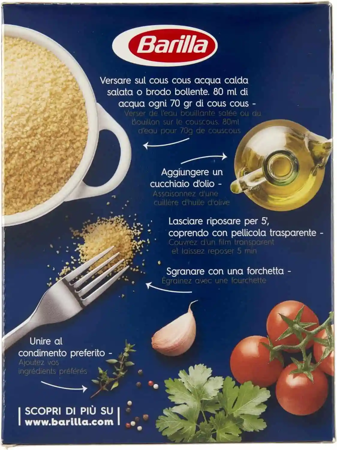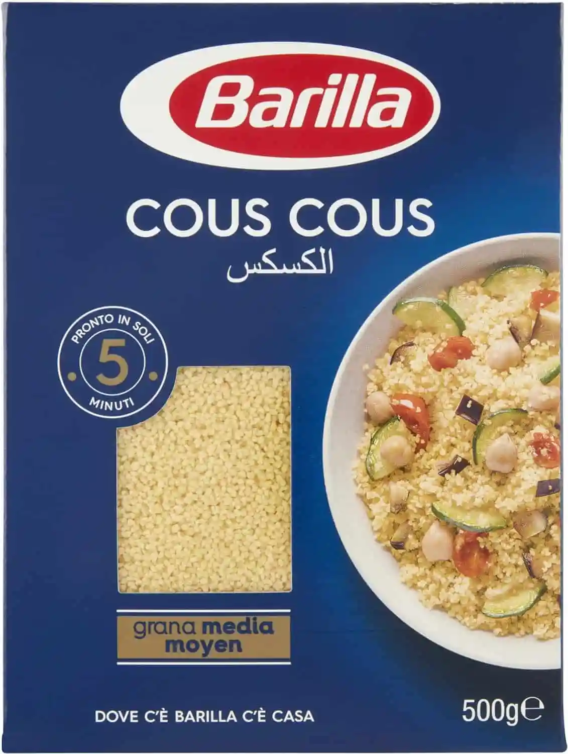 Barilla Cous Cous, 500 g. Preparare il nostro Cous cous è facilissimo. Basta versare sul prodotto acqua calda salata o brodo bollente, lasciarlo riposare qualche minuto ed otterrai un prodotto dalla consistenza perfetta, ideale per le tue ricette di carne, pesce o verdure. Ideale per preparazioni asciutte come vuole la tradizione mediterranea. Prova la ricetta con verdure rosolate in padella, ceci e pomodorini caramellati. Aggiungi eventualmente carne di pollo o pesce a seconda delle tue preferenze. Barilla è un’azienda italiana di famiglia che coltiva la passione per la pasta dal 1877. I nostri sughi, pasta e cereali sono gustosi, sicuri e contribuiscono a una dieta equilibrata sulla tua tavola.