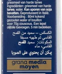 Cous cous – Semola di GRANO duro precotta. Ingredienti: semola di GRANO duro, acqua. Può contenere tracce di SOIA e SENAPE. Conservare in luogo fresco e asciutto.