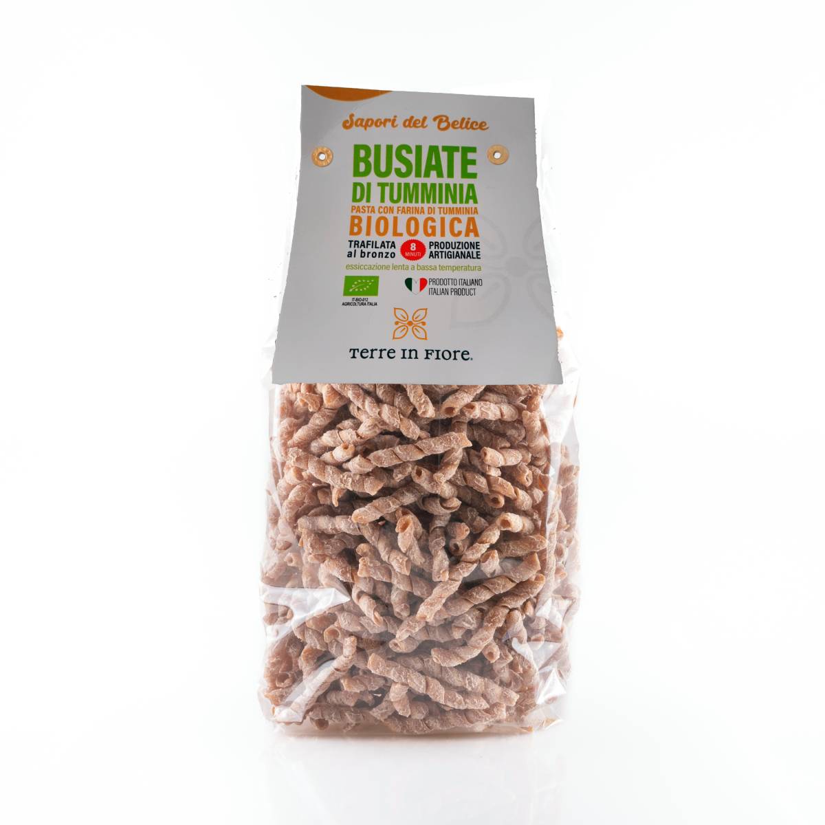 Questa versione è molto speciale perchè la prepariamo utilizzando il grano “Tumminia” biologico, un grano antico siciliano, oggi praticamente scomparso. Si tratta di un frumento resistente al secco, alla stretta, alle ruggini e permette una produzione soddisfacente anche con decorsi primaverili non favorevoli, quindi non subisce trattamenti vista la sua grande capacità di addatamento alle sfavorevoli condizioni climatiche.