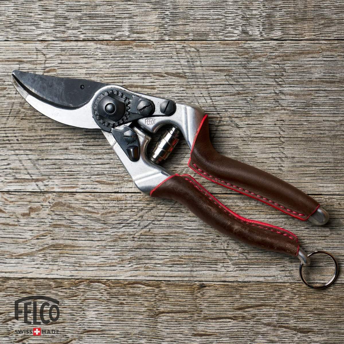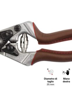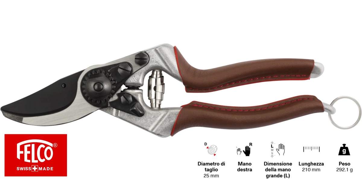 Le impugnature rivestite in pelle garantiscono una presa comoda e sicura, riducendo l'affaticamento e la tensione muscolare durante le sessioni di potatura prolungate. Il design ergonomico assicura una perfetta aderenza della mano e si adatta nel tempo alla morfologia della mano dell'utente. Le cuciture rosse esaltano le curve e riprendono il colore iconico dei manici FELCO.