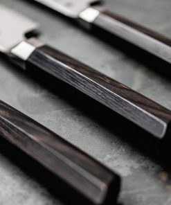 L’impugnatura, dal tipico stile orientale, è di forma ottagonale ed è realizzata in legno pakka a grana nera. Ottima l’ergonomia dell’impugnatura che garantisce un buon controllo durante il taglio.