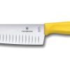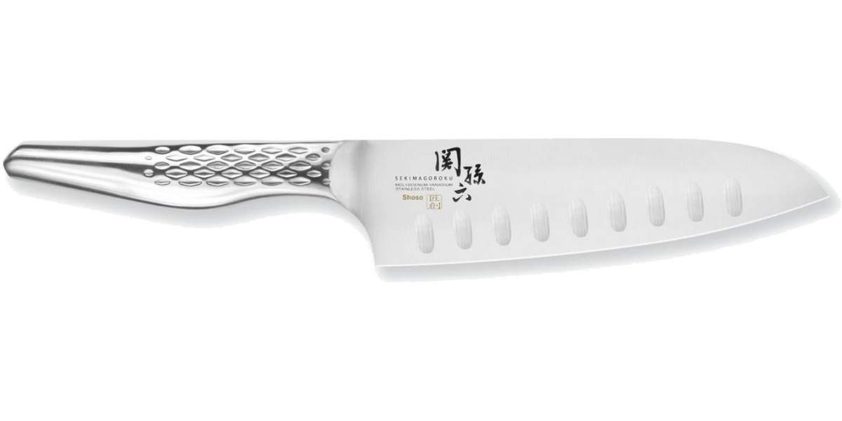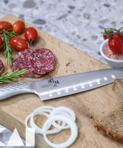Inoltre rispetto al classico Santoku, questo coltello è olivato, infatti presenta delle alveolature sulla lama che consentono al cibo di distaccarsi più facilmente dalla lama durante il taglio.