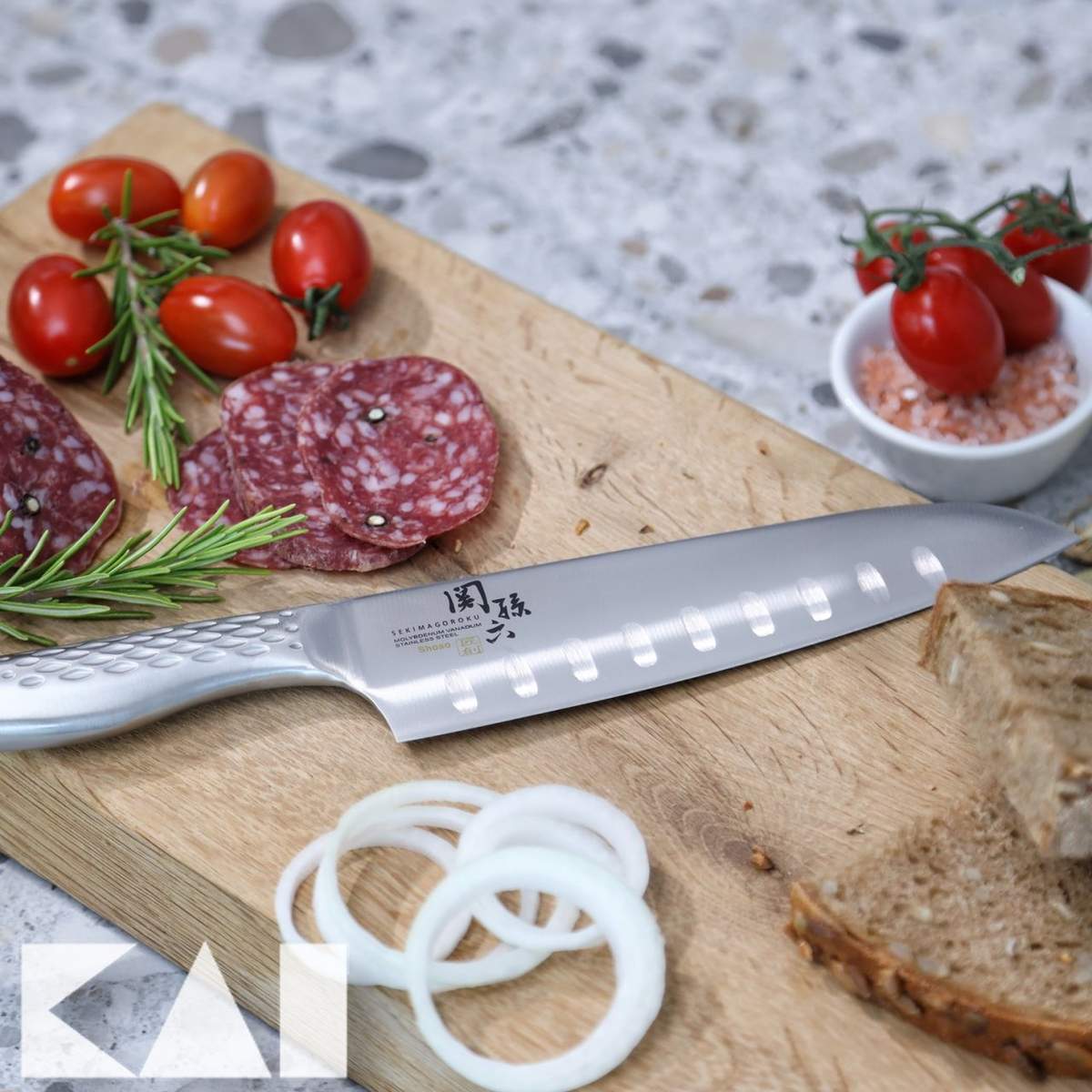 Avere un Santoku Kai in cucina ti permette di sfruttare le sue “tre virtù” e quindi tritare finemente, affettare o tagliare verdure ma anche pesce o carne con poco sforzo. Questo perché la lama è composta da eccellente acciaio inox 5Cr15MoV con affilatura simmetrica e convessa che garantisce qualità nel taglio e fa si che il filo duri nel tempo.
