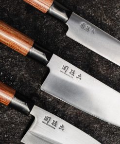 Seki Magoroku Redwood è una serie di coltelli da chef con una robusta qualità di acciaio inossidabile e caratteristiche tipicamente giapponesi. Con le sue lame altamente lucidate, la serie comprende lame sia a un filo che a doppio filo che condividono i comuni denominatori di funzionalità stabile ed equilibrata e affilatura. Il design combina una forma di base minimalista con l’estetica tradizionale giapponese. Il nome deriva dall’uso del legno di pakka rosso, da cui è ricavato il manico. Il manico in pakkawood è particolarmente resistente e resistente all’umidità.
