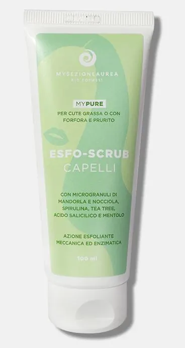 Esfo Scrub Capelli con microgranuli di mandorla e nocciola, spirulina, tea tree, acido salicilico e mentolo.