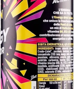 Acqua minerale naturale “Fonti di Crodo-Lisiel”, zucchero, destrosio, succo di frutta da concentrato (15%) (uva, mango, mela, ananas, frutto della passione, albicocca, arancia, guava, pesca, limone), anidride carbonica, taurina (0,4%), caffeina (0,03%), vitamine (niacina (B3), B6, B12), L-carnitina, aromi, sale, inositolo, acidificante (E330), regolatori di acidità (E331, E332), stabilizzanti (E414, E415), conservanti (E211, E202), colorante (E160e), edulcorante (E955).