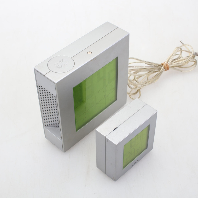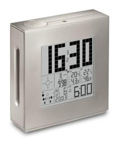 Stazione meteorologica con orologio radio controllato. La confezione comprende un corpo principale e uno più piccolo che serve da sensore esterno.