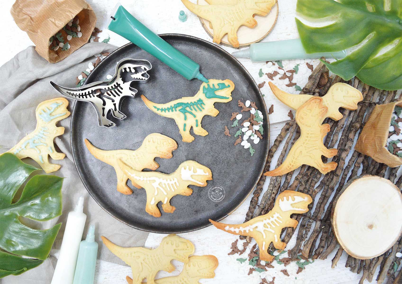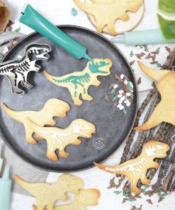 Set composto da tagliabiscotti e goffratore per creare biscotti, frollini o decorazioni a forma di dinosauro.
