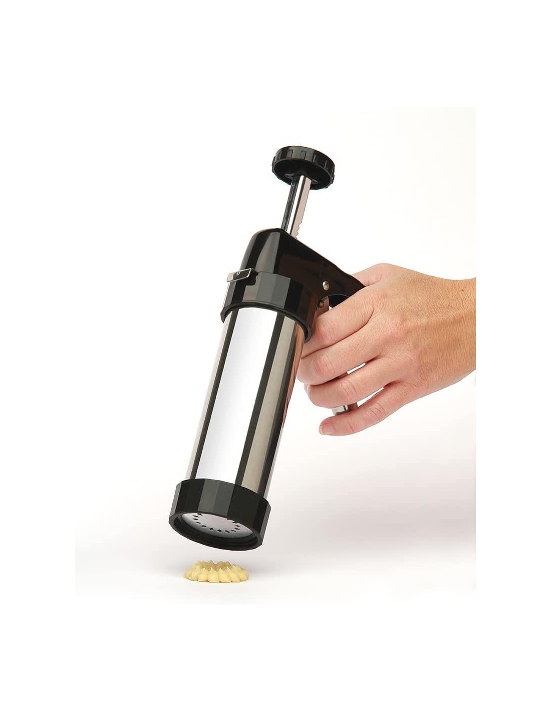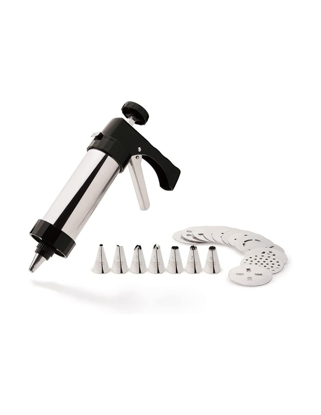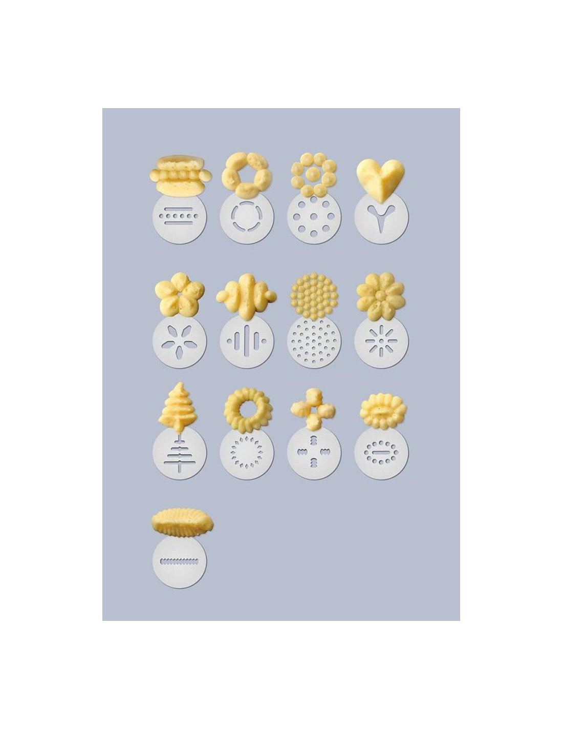 Perfetto per la preparazione di biscotti dolci e salati grazie alle 13 trafile di diverse forme in acciaio inox incluse nella confezione.