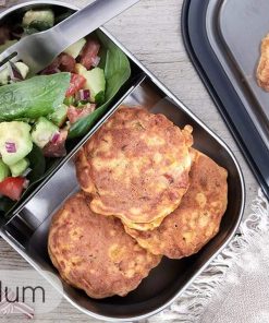 All’interno del pratico contenitore, che può andare sia in forno che nel congelatore, c’è un comodo scomparto in acciaio che permette di dividere il cibo facilmente mentre la forchetta sempre in acciaio è posizionata lateralmente ed è bloccata dal cinturino in silicone che contribuisce a chiudere il contenitore.