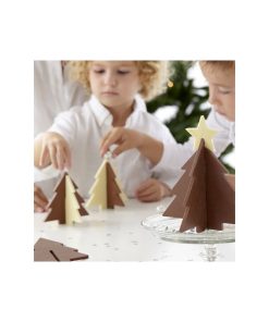 Basterà colare nello stampo in silicone il cioccolato temperato fuso, aspettare che si solidifichi e staccare dallo stampo le cialde di cioccolato formatesi. Incastri un pezzo nell’altro ed otterrai due albero di Natale.