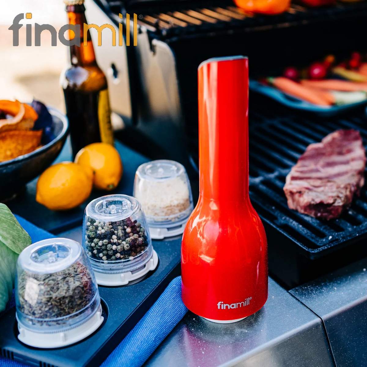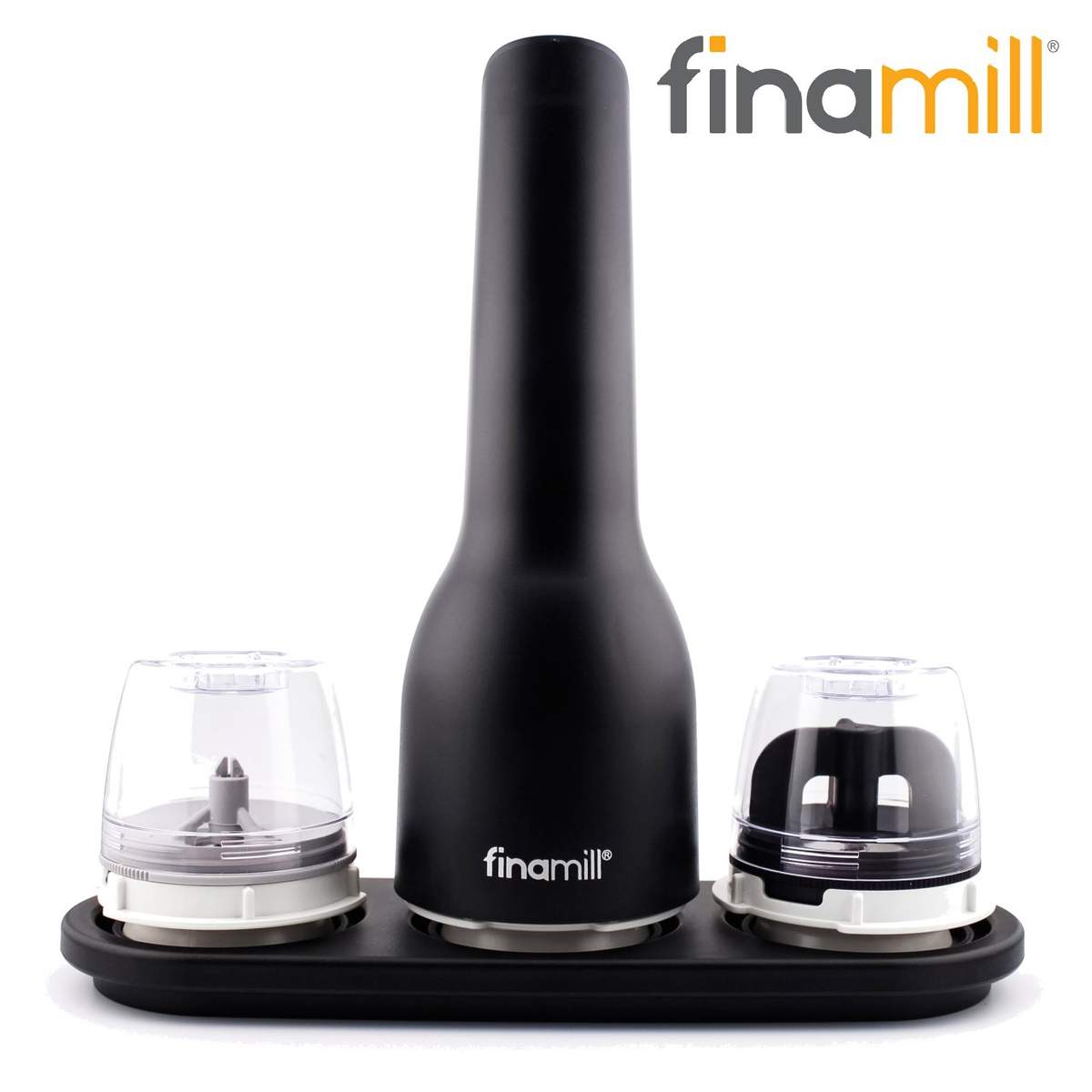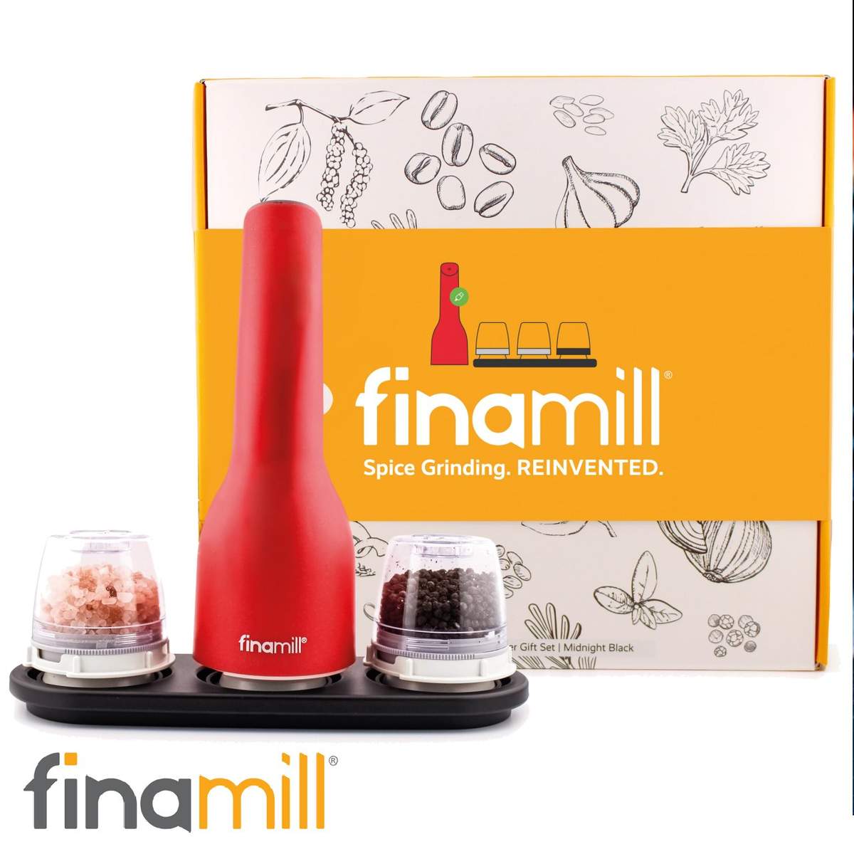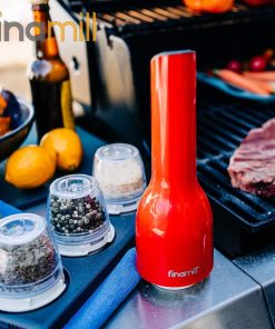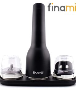 Il set infatti è composto da un macina spezie Finamill (in colorazione Sangria o Black), da un vassoio rettangolare porta spezie da tre posti, e ben due capsule FinaPod (Pro Plus e Max) intercambiabili con un semplice clic e che sono utili anche per la conservazione delle spezie.