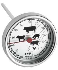 Termometro per grassi in acciaio inox. L’asta di inserimento nell’olio ha un gancio che permette di bloccare il termometro al bordo della pentola.