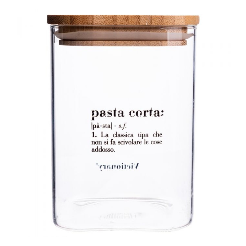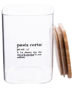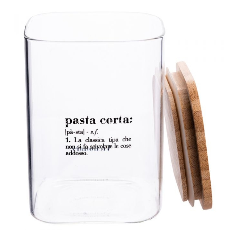 Barattolo quadrato in vetro con coperchio in bambù e guarnizione in silicone.